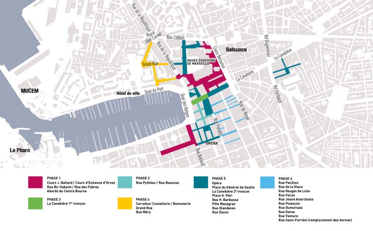 La requalification de l’hyper centre de Marseille a démarré en février 2019. Une grande partie des aménagements ont déjà été réalisés. Et les changements sont spectaculaires. De part et d’autre du Vieux-Port, en remontant La Canebière, place du Général de Gaulle, dans les quartiers du centre Bourse, de l’Opéra et jusqu’à la rue Saint-Ferréol… s’ouvre désormais un ample périmètre de déambulation, apaisé, largement libéré de la voiture.